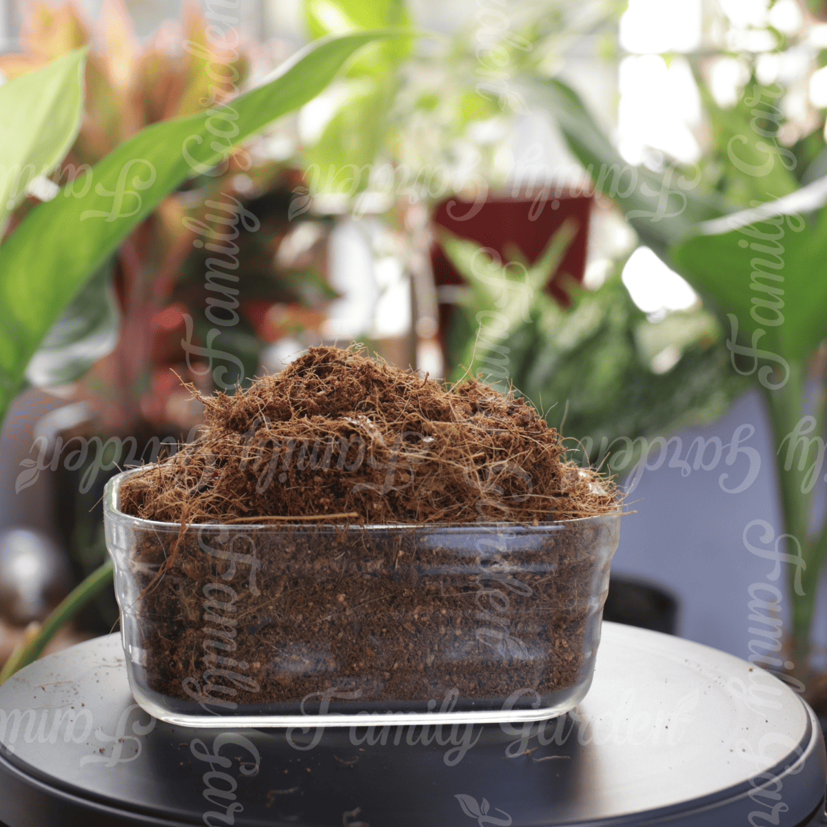 - Nguyên liệu chính là mụn dừa từ vỏ dừa già khô. Sản phẩm viên nén xơ dừa nhà Family Garden được sản xuất từ các mụn dừa đã qua xử lý khiến các chất chát (lignin và tanin) gây xót cây bị loại bỏ hoàn toàn, được nén chặt và bọc bởi lớp màng co.
